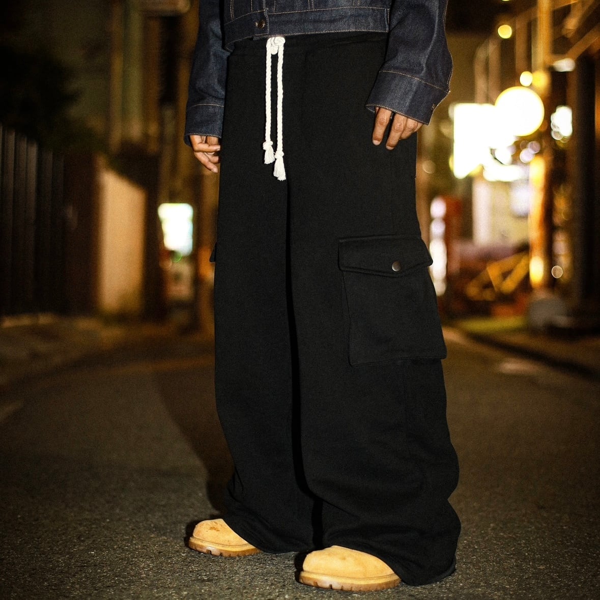 ② ウエストには太いロープを採用し、シンプルながら強烈なアクセントをプラス。ゆとりあるバギーシルエットが迫力を生み、両腿のカーゴポケットが実用性と武骨な雰囲気を演出。デイリーユースからカルチャーシーンまで、幅広く存在感を発揮します。