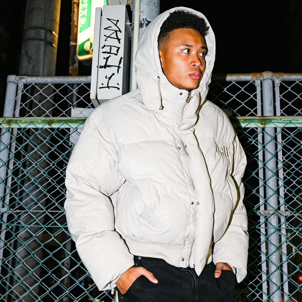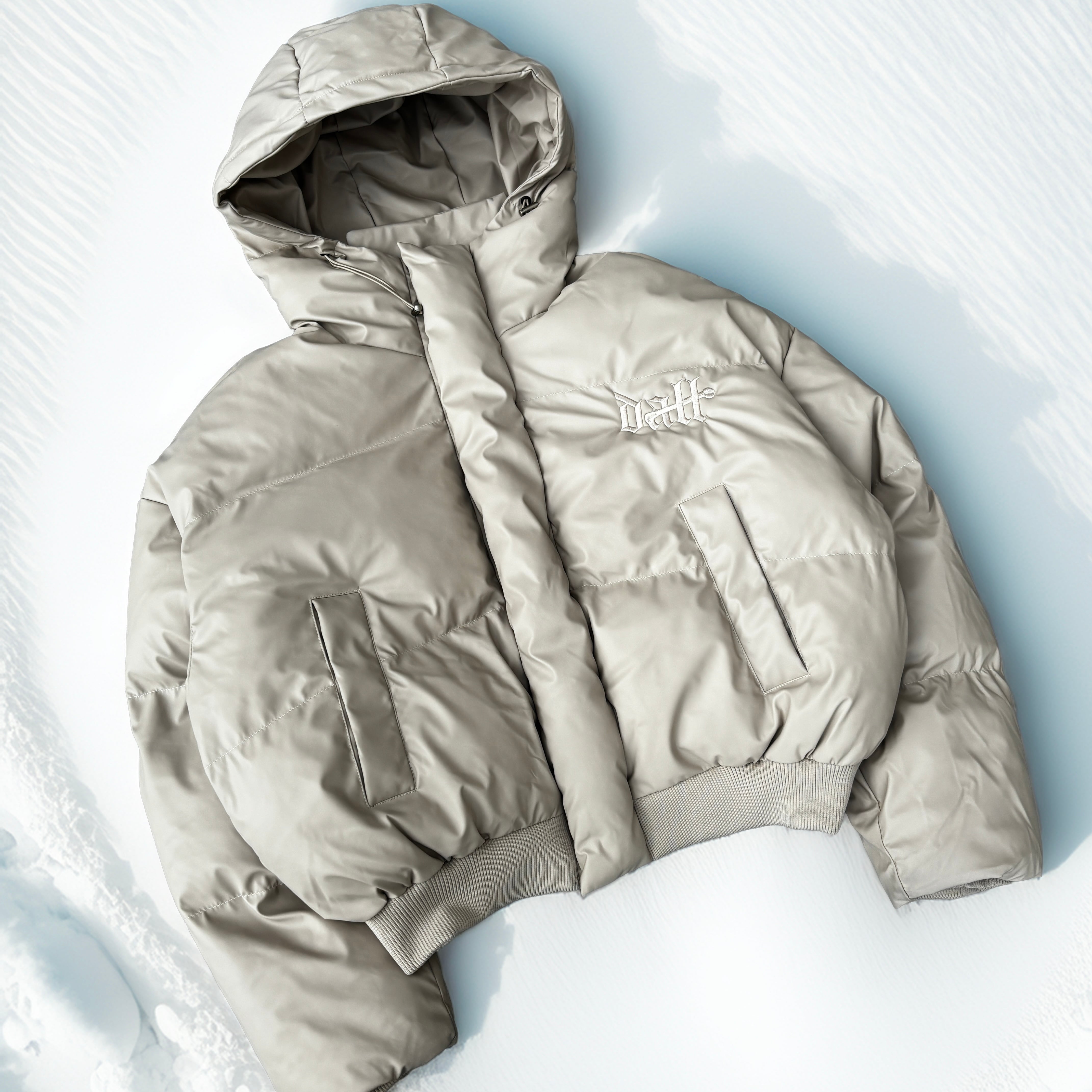 ① 艶感のある高品質なプファージャケットが、シンプルながらもスタイリッシュな存在感を与えます。どんなコーディネートにもエレガントさをプラスしてくれる一品です。