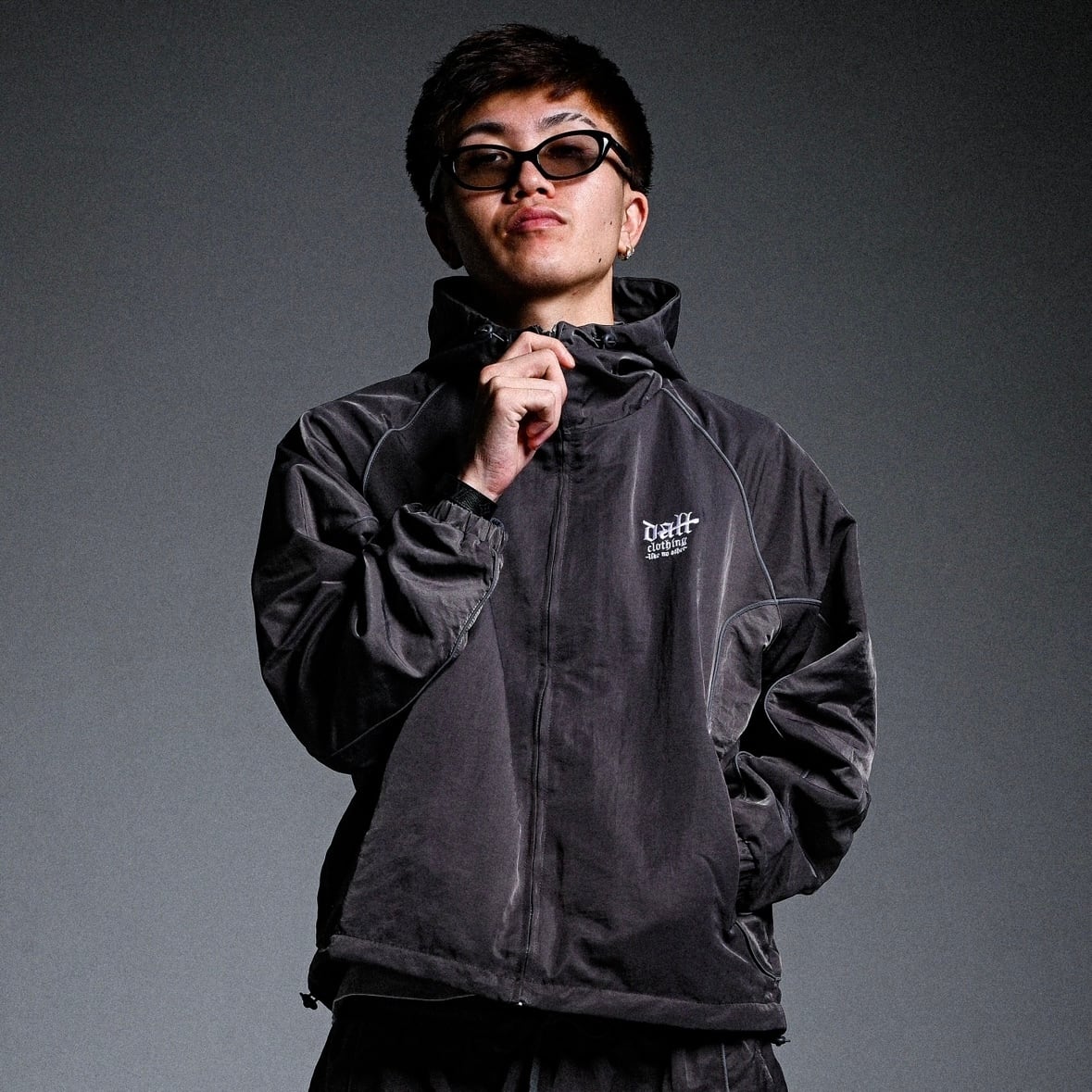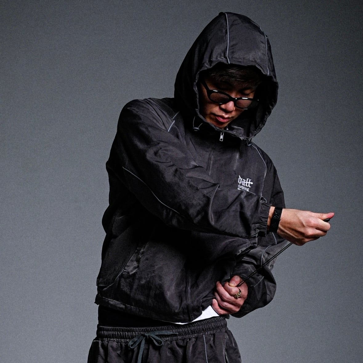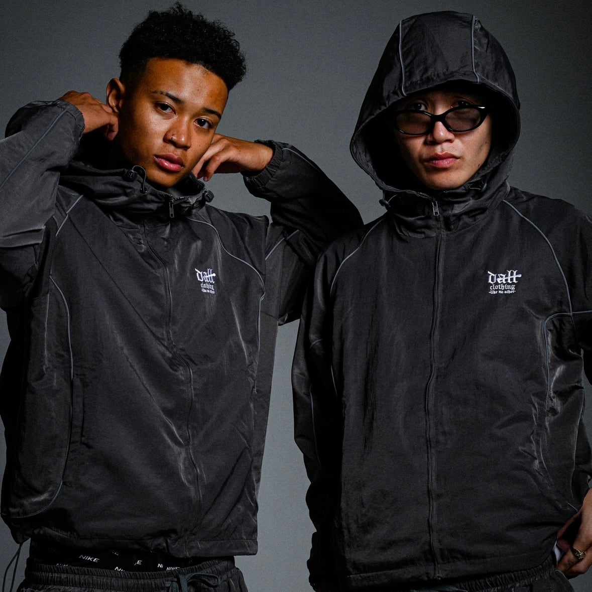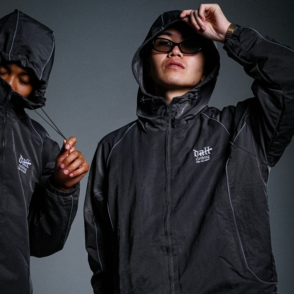 マット寄りの質感をもつナイロンをベースに、パイピングにはリフレクター素材を採用。光を受けて控えめに浮かび上がるラインが、ミニマルな構造の中に確かな主張と立体感を生む一着です。胸元にはコントラストで効かせた刺繍ロゴを配置し、ストリートの硬さと洗練をバランスよく共存させています。