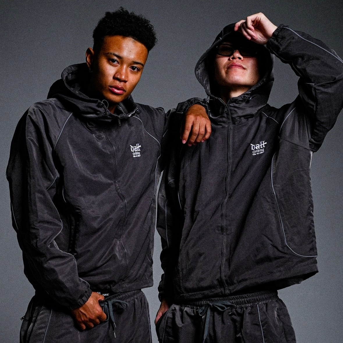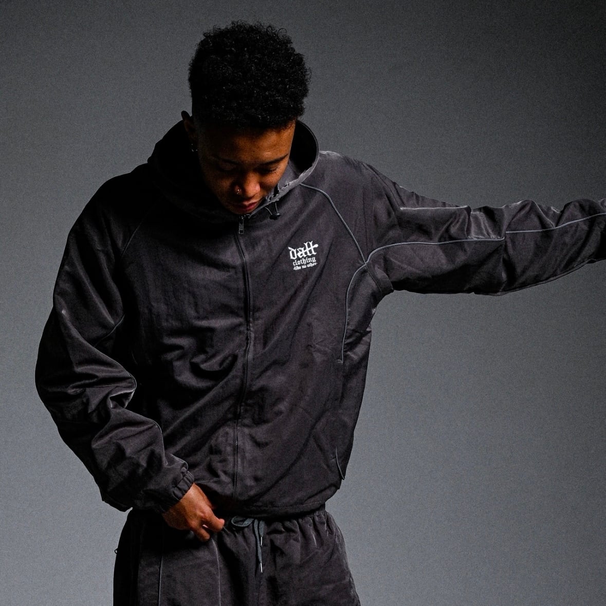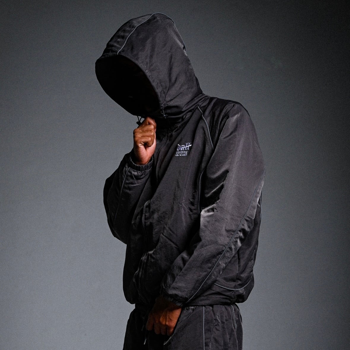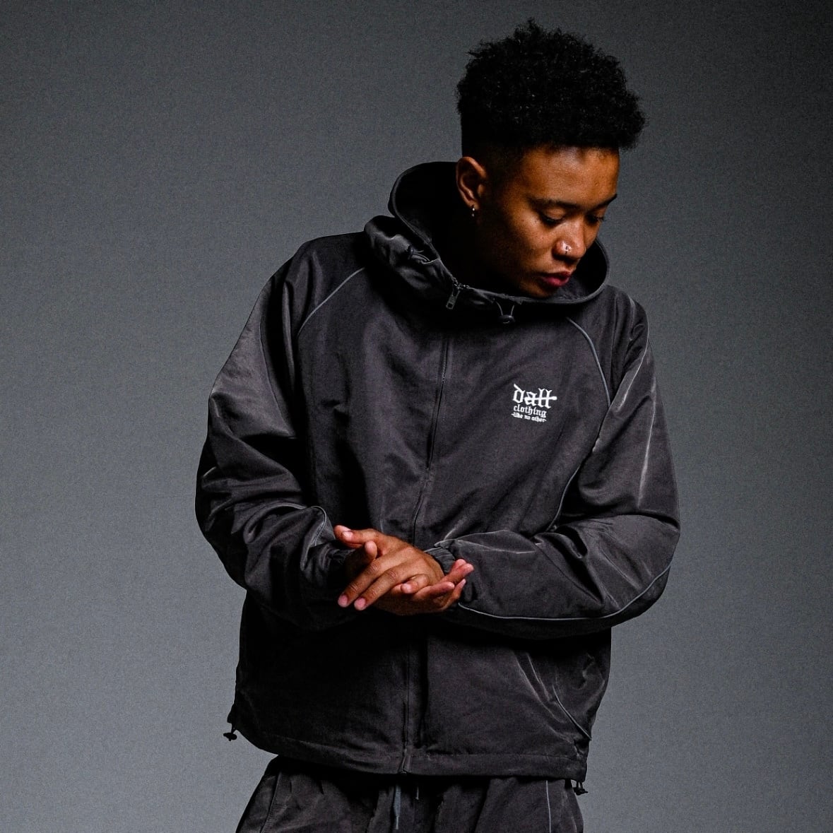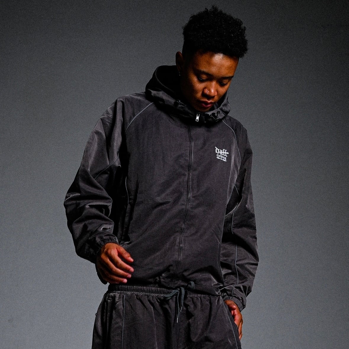 マット寄りの質感をもつナイロンをベースに、パイピングにはリフレクター素材を採用。光を受けて控えめに浮かび上がるラインが、ミニマルな構造の中に確かな主張と立体感を生む一着です。胸元にはコントラストで効かせた刺繍ロゴを配置し、ストリートの硬さと洗練をバランスよく共存させています。