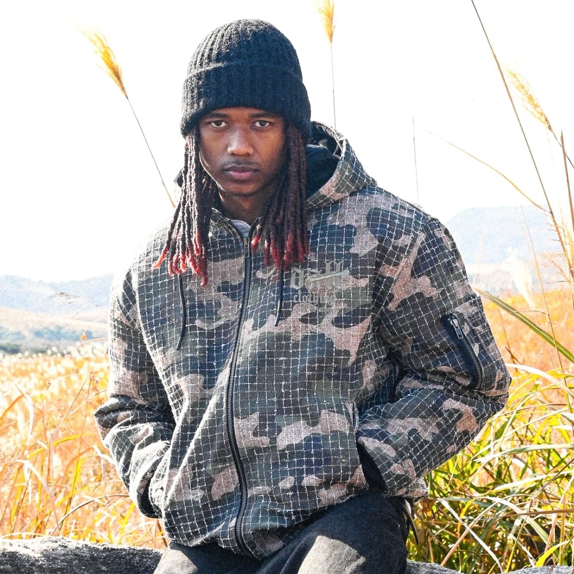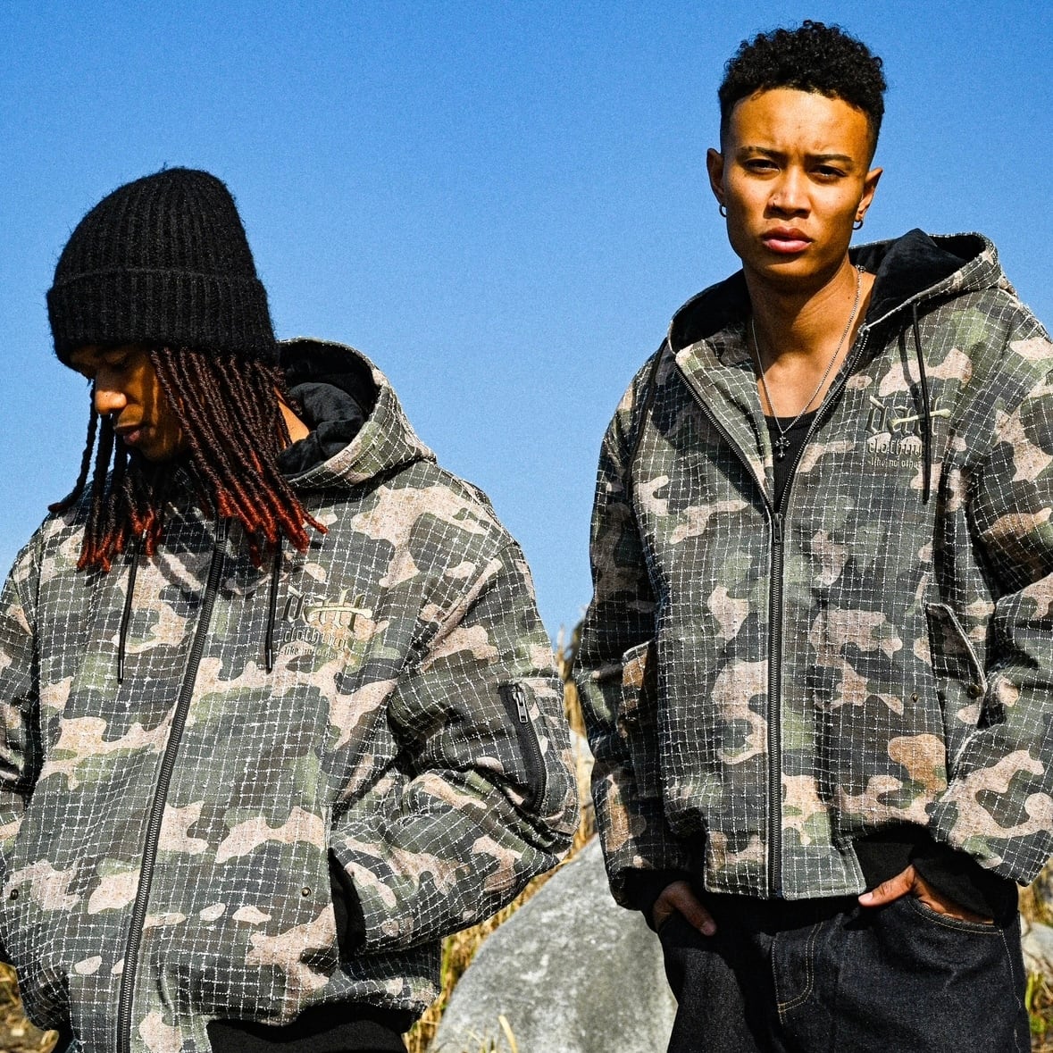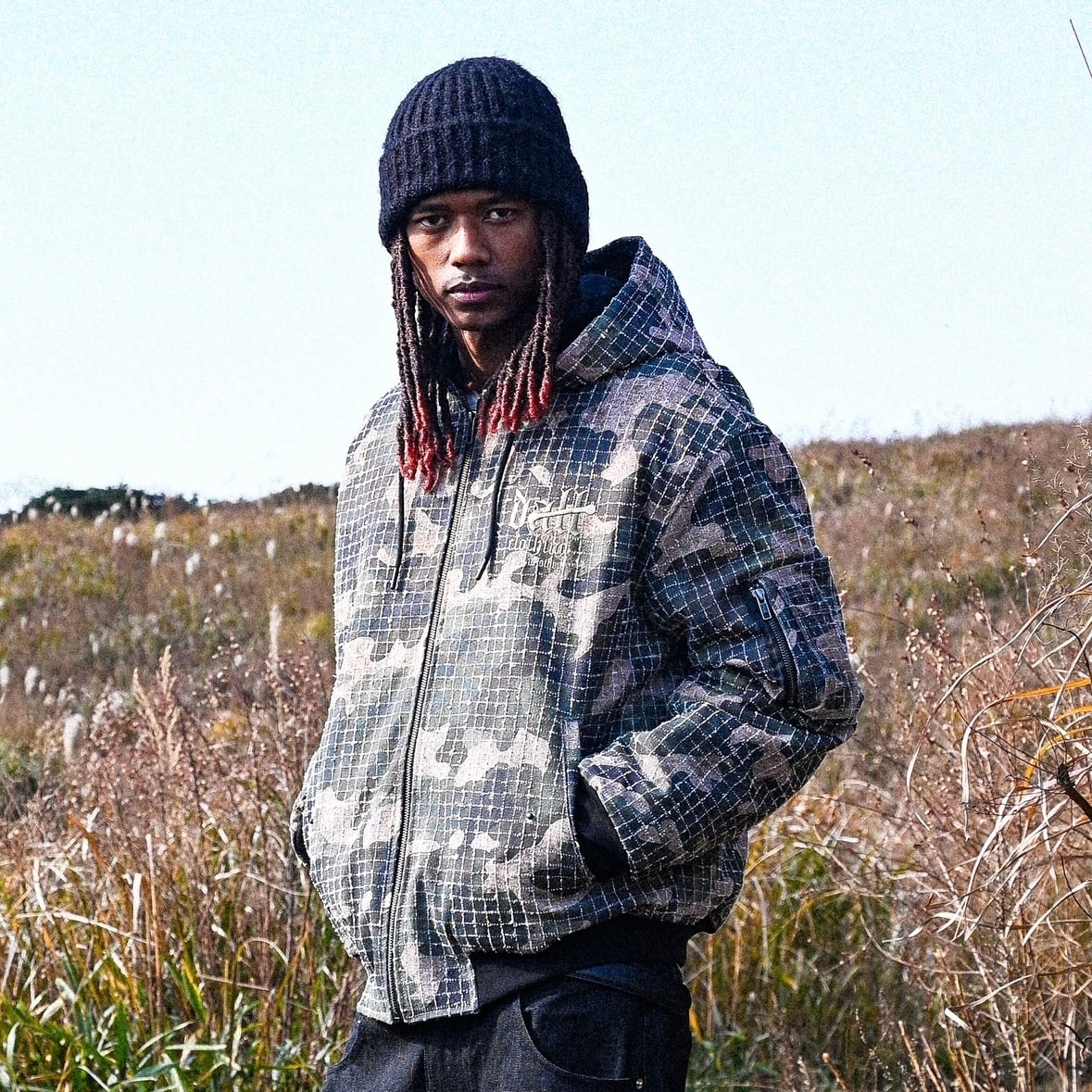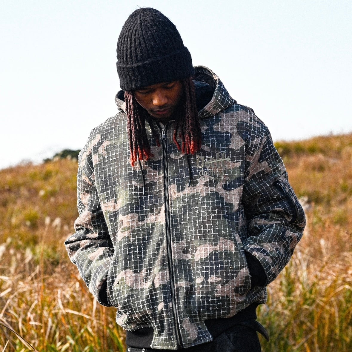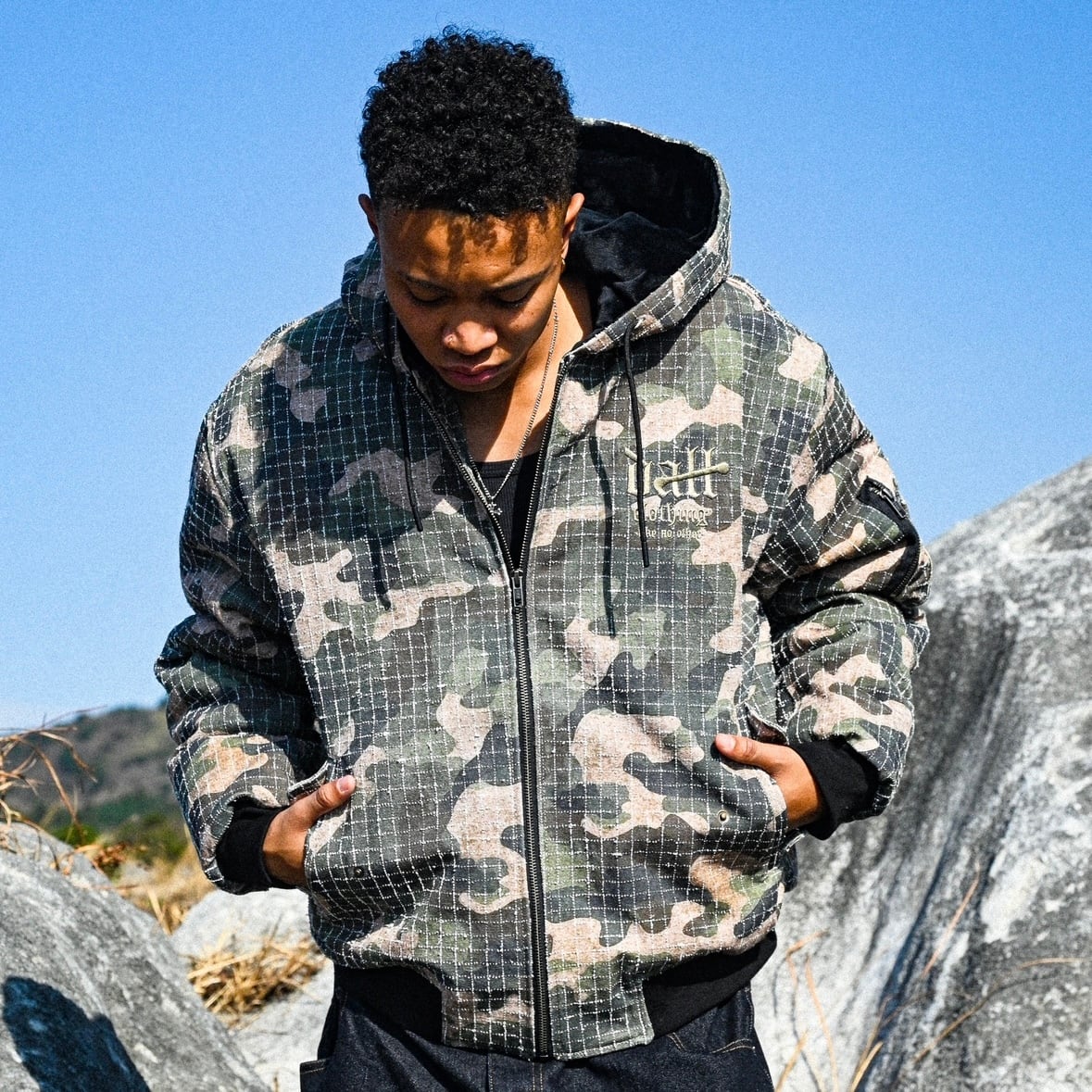 ① リップストップカモを、静かにストリートへ引き寄せたフーデッドジャケット。格子状に走るリップストップの織りと、抑えたトーンのカモフラージュが重なり合い、主張しすぎないのに、確実に“強さ”が残る一着です。ミリタリー由来の素材感をそのまま使うのではなく、DALLらしく削ぎ落とし、日常に落とし込めるバランスで設計しています。