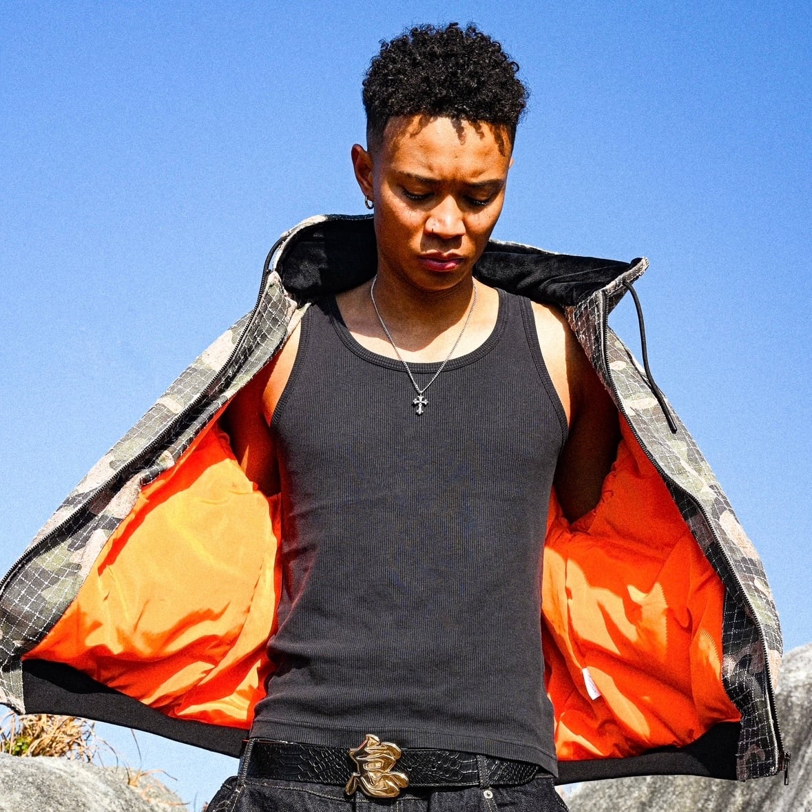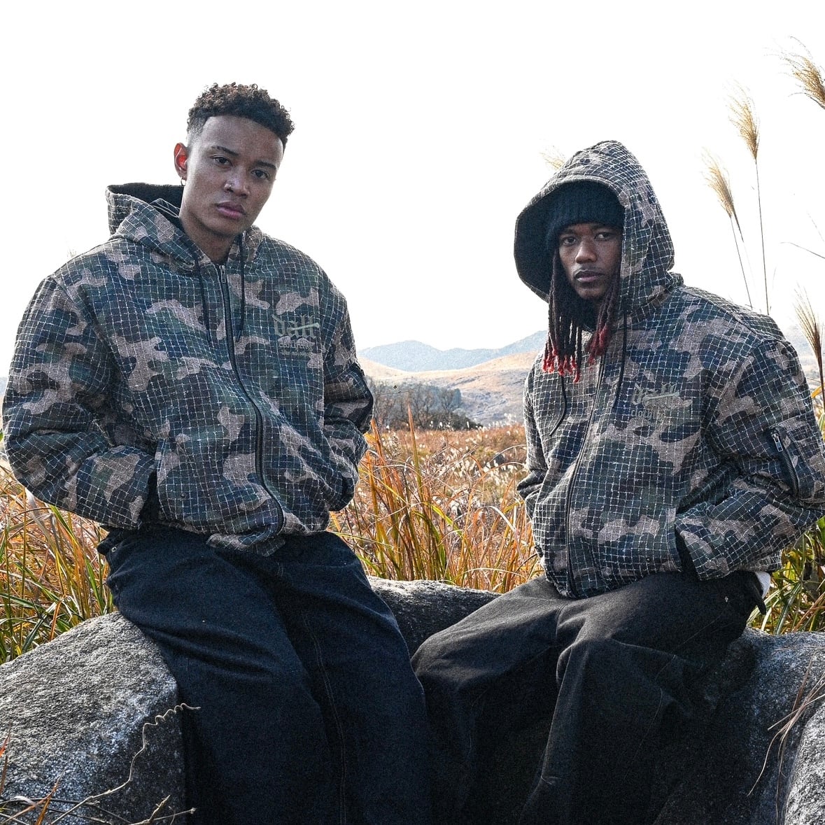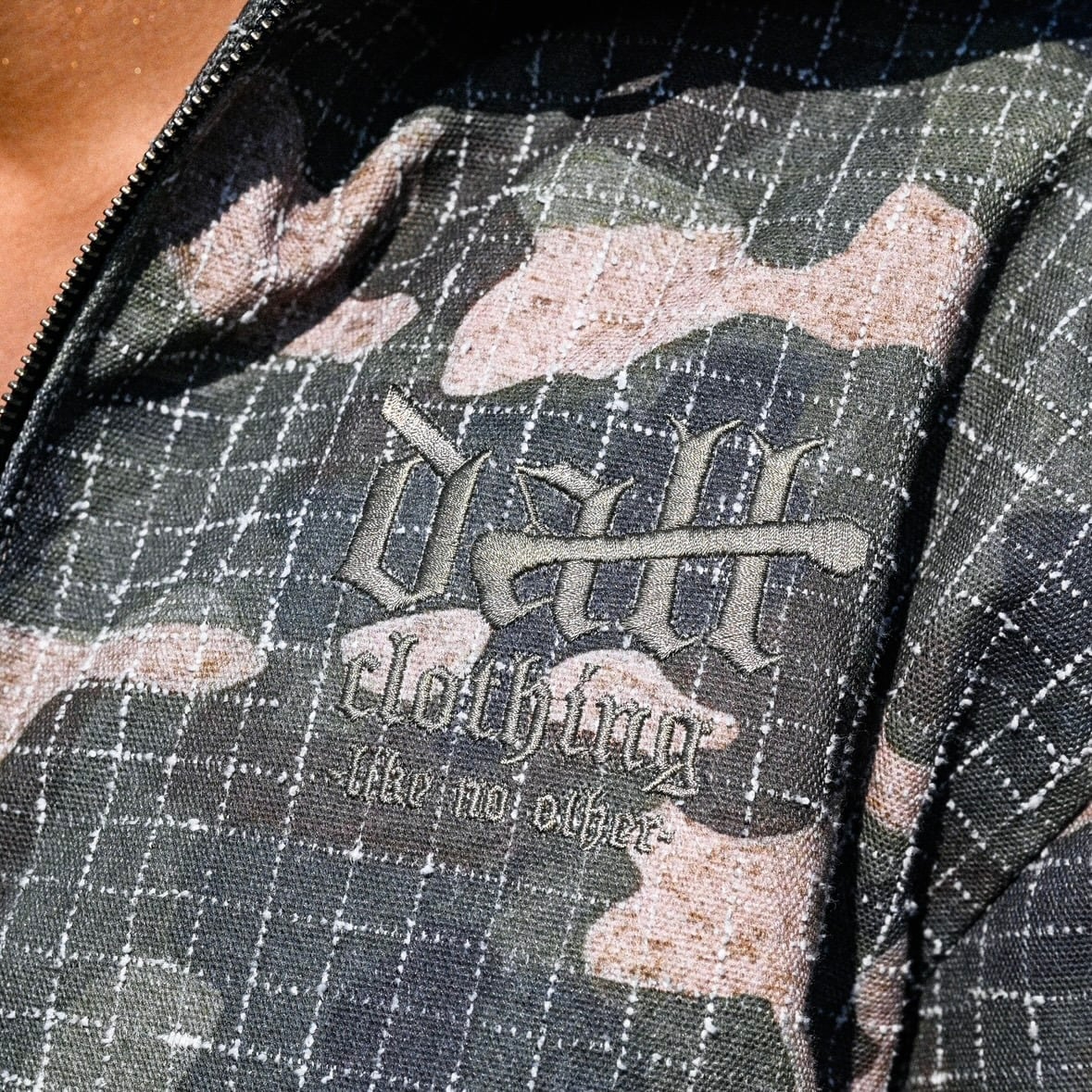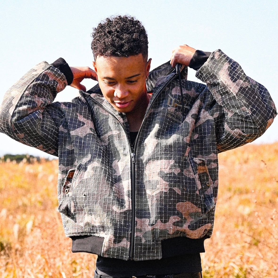 ② 表地には耐久性に優れたリップストップ生地を採用。裂けにくい構造が生むハリと軽さが共存し、着用時には自然と立体感が生まれます。フード付きのジップアップ仕様で、首元までしっかりと包み込む構造。胸元には同色系でまとめたOGロゴ刺繍を配置し、柄の中に溶け込むような、控えめで計算されたアクセントに仕上げています。