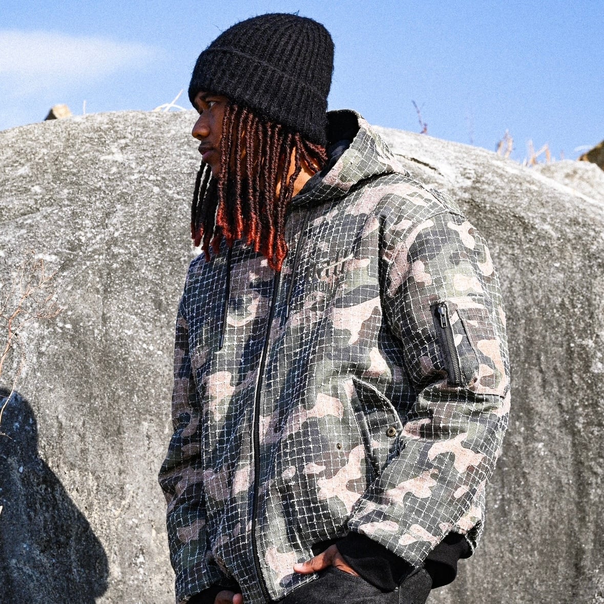 ③ 程よくゆとりを持たせたシルエットで、インナーを選ばずレイヤードが可能。軽量ながら頼りなさはなく、街でもフィールドでも違和感なく成立する着心地。ジップを閉じれば無骨に、開ければ抜けのある表情へと変化し、一着で複数のスタイルを内包します。デニムやカーゴ、スウェットパンツと合わせてもトーンを崩さず、シンプルなボトムスほど、このジャケットの素材感と柄が引き立つ。主役にも、スタイルを引き締めるピースにもなる、使い込むことで完成していくフーデッドジャケットです。