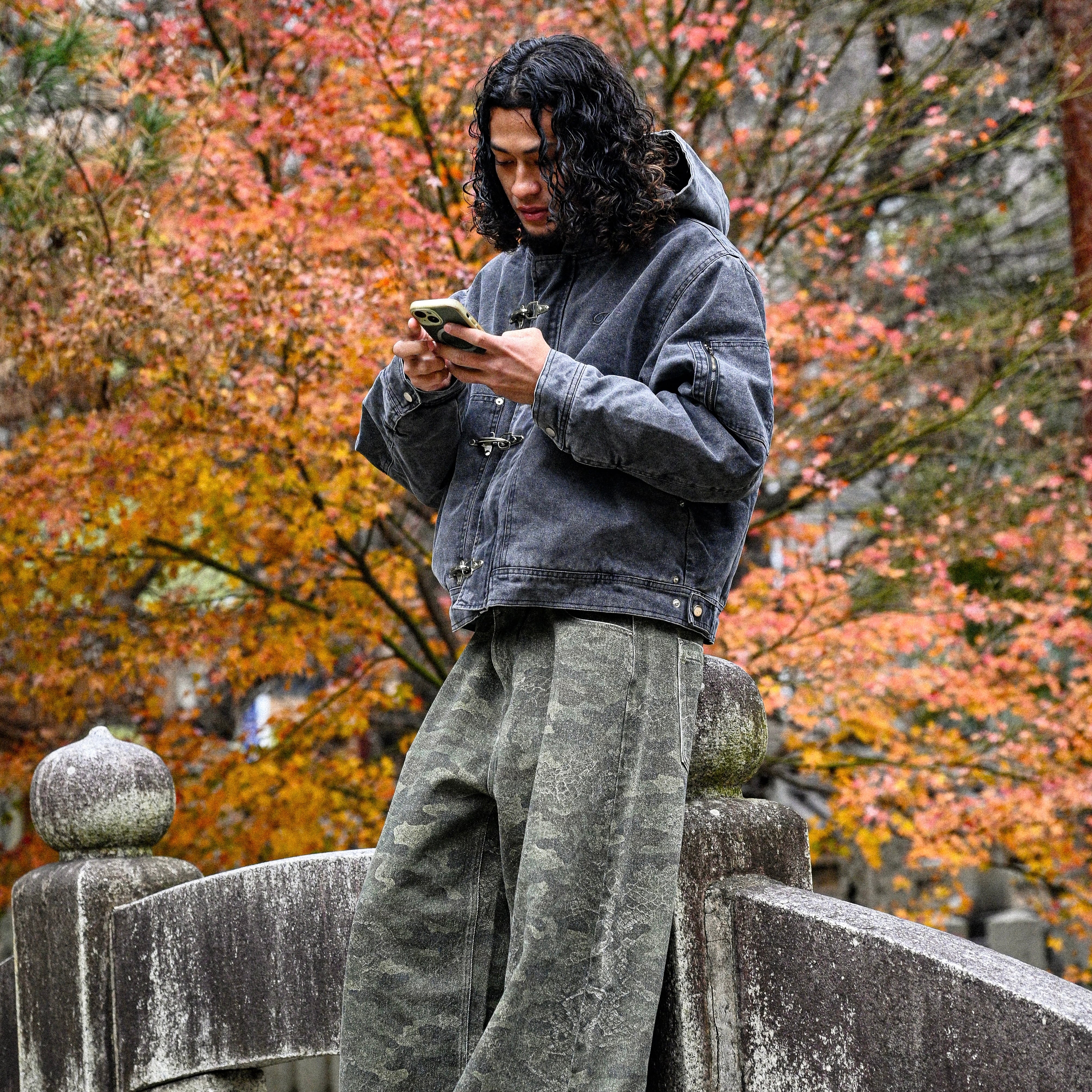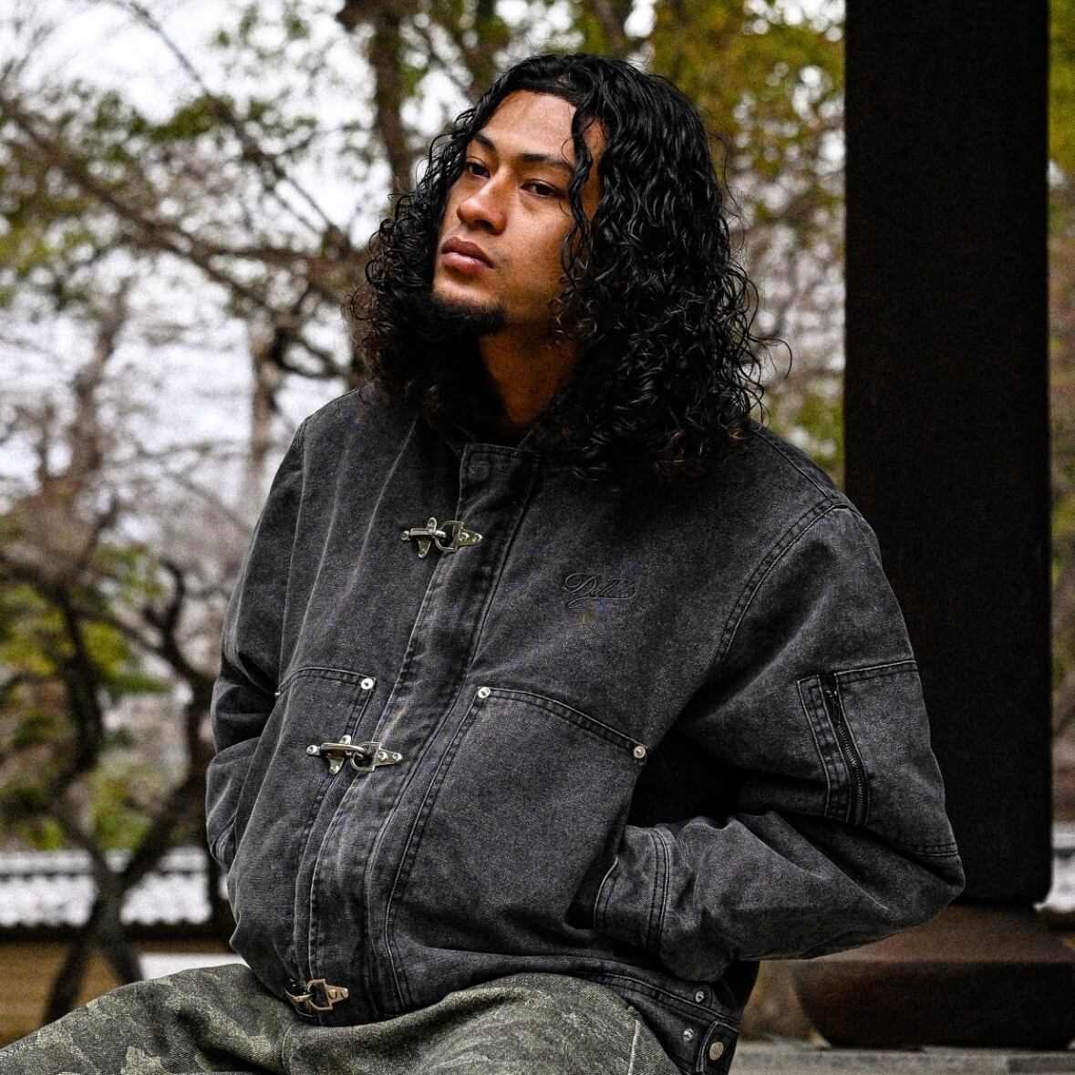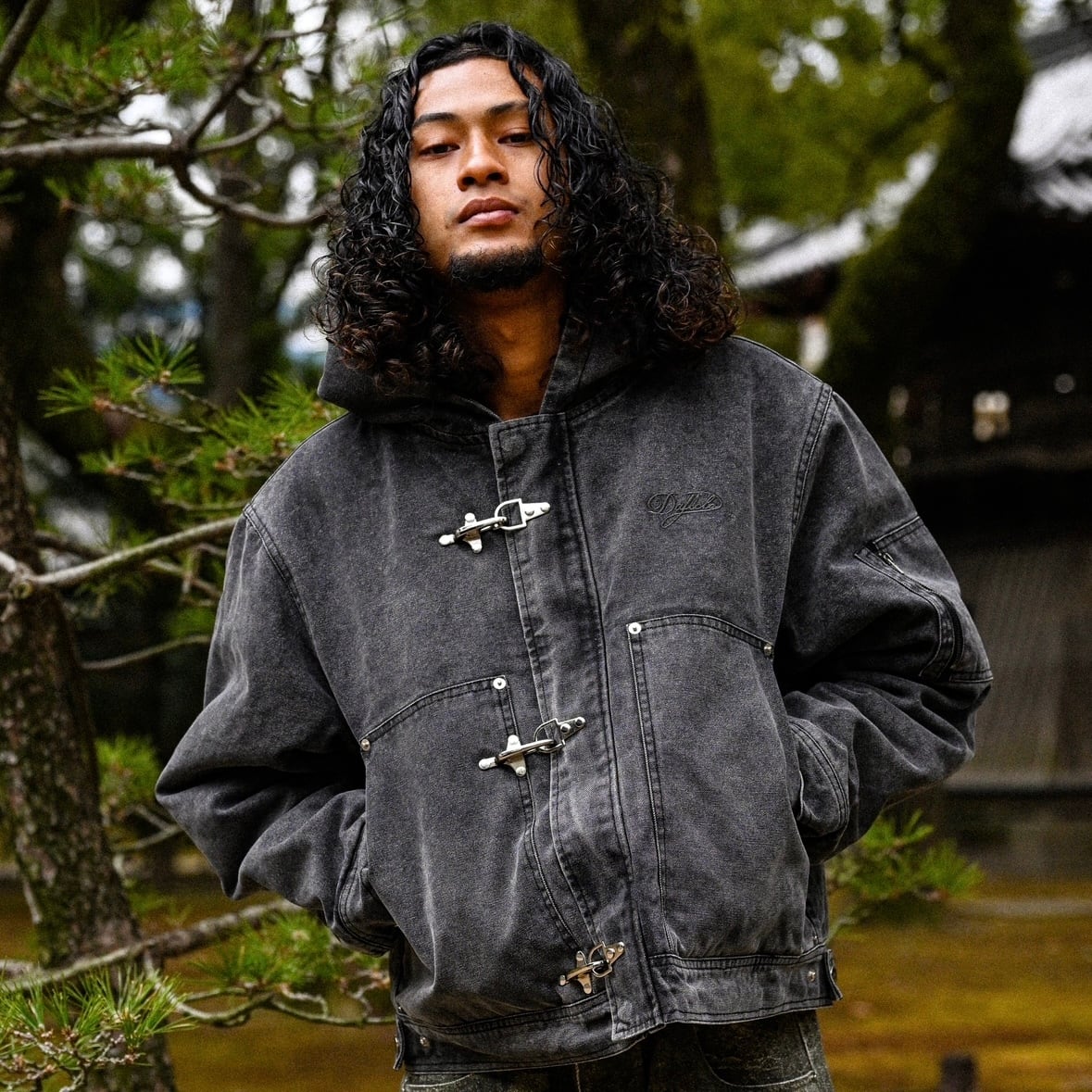 ①消防服をルーツに持つファイヤーマンジャケットを、静かにストリートへ引き寄せた一着。肉厚なキャンバス生地にウォッシュ加工を施し、均一ではない陰影と、最初から着込まれたような表情を与えています。ワーク由来の無骨さを前面に出すのではなく、短めの着丈と広めに取った身幅によって、日常に馴染むバランスへと再構築。重さを感じさせず、それでいて芯のある強さだけを残した、DALLらしい設計です。