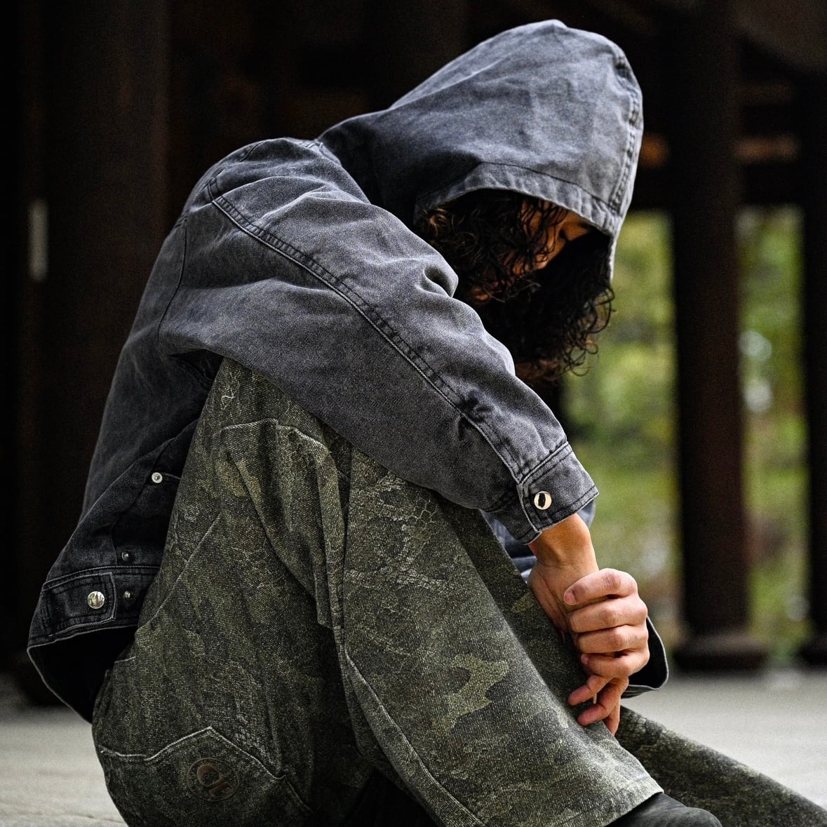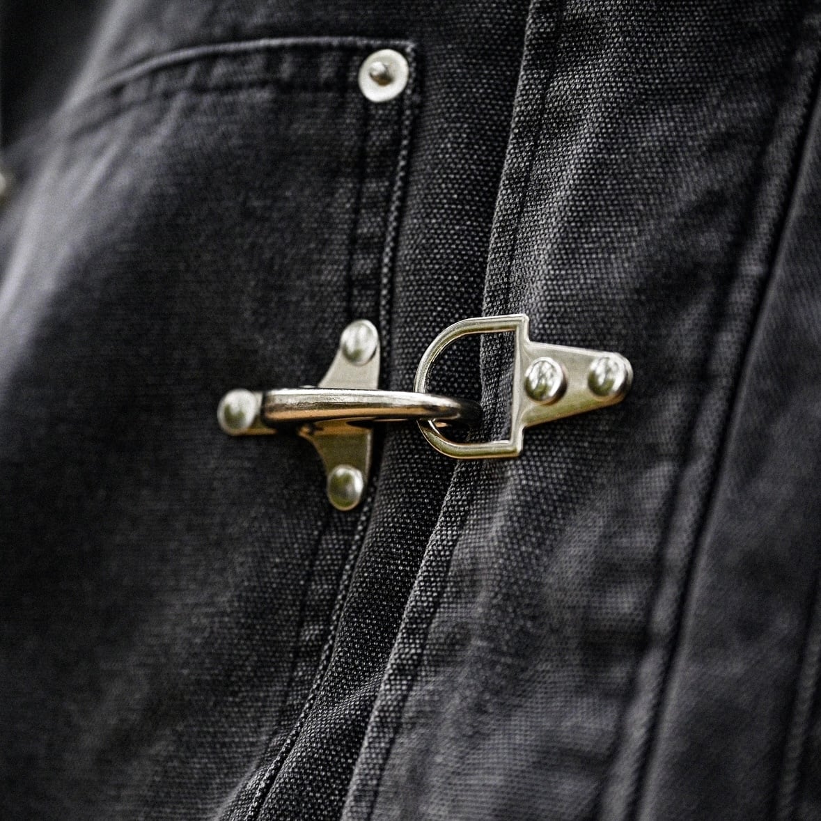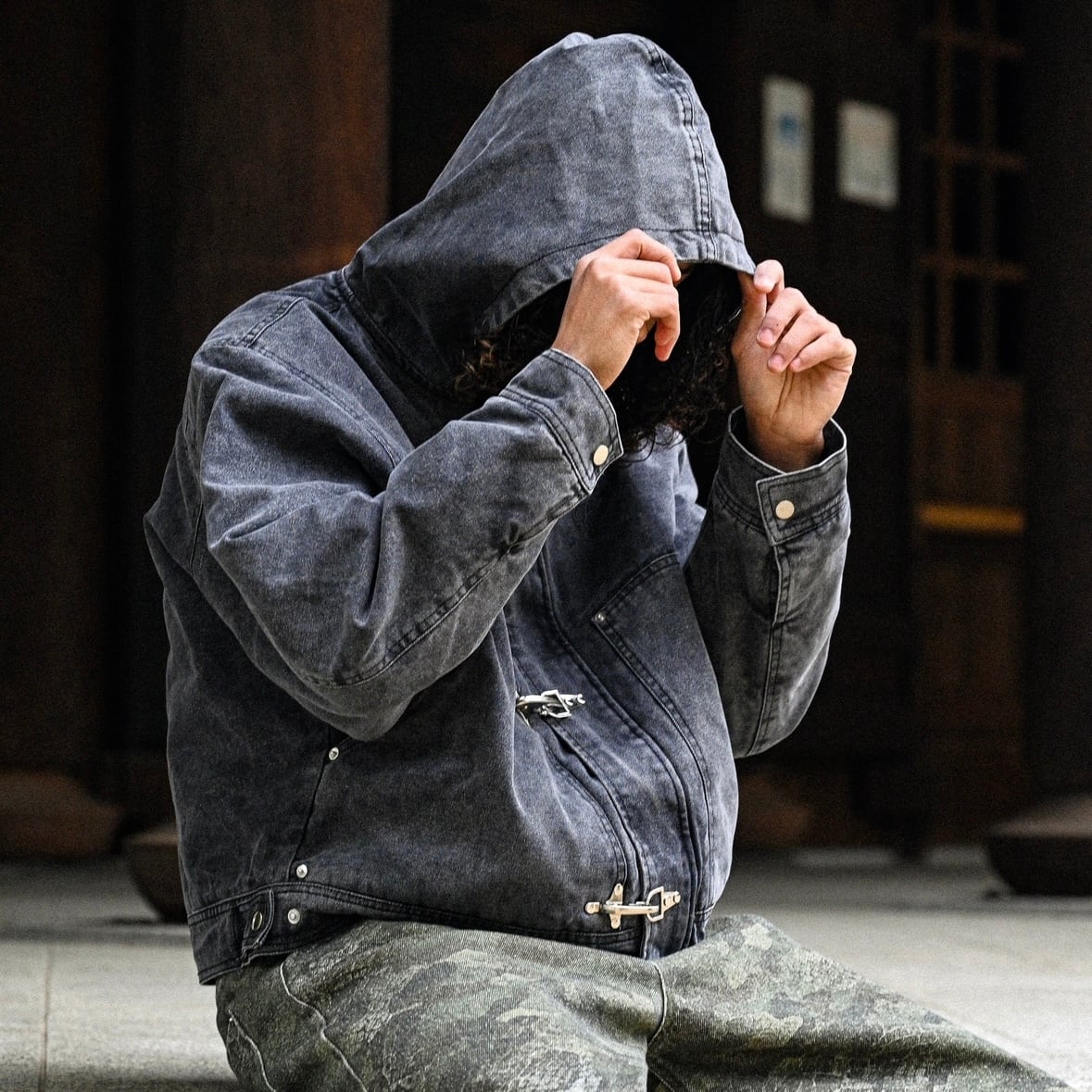 ①消防服をルーツに持つファイヤーマンジャケットを、静かにストリートへ引き寄せた一着。肉厚なキャンバス生地にウォッシュ加工を施し、均一ではない陰影と、最初から着込まれたような表情を与えています。ワーク由来の無骨さを前面に出すのではなく、短めの着丈と広めに取った身幅によって、日常に馴染むバランスへと再構築。重さを感じさせず、それでいて芯のある強さだけを残した、DALLらしい設計です。