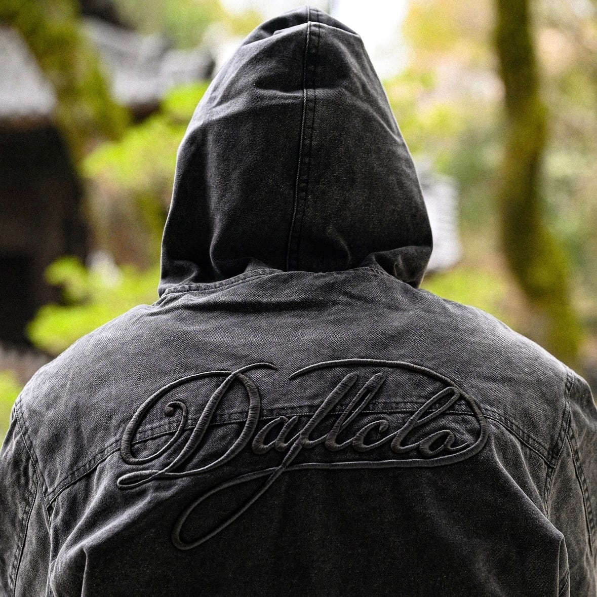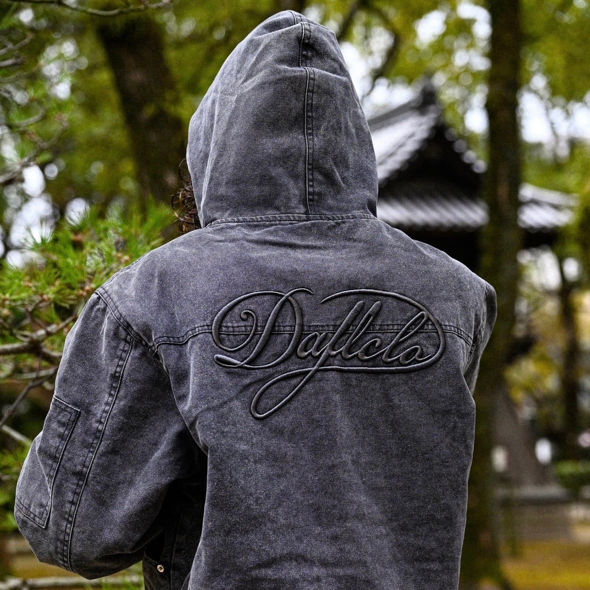 ③背面には、立体感のある3Dロゴ刺繍を大胆に配置。サイズ感はあえて抑えず、後ろ姿でしっかりと語る設計にしています。短丈×身幅広めのシルエットと相まって、背中に自然な迫力が生まれ、無地でありながら確実に印象を残す一着に。バックルを留めれば引き締まり、開ければ抜けのあるボリューム感へと表情が変化します。デニムやカーゴ、スウェットパンツと合わせてもトーンを崩さず、主役としてもスタイルの軸としても機能。前は静かに、背中で語る。使い込むことで完成していく、DALLを象徴するファイヤーマンジャケットです。