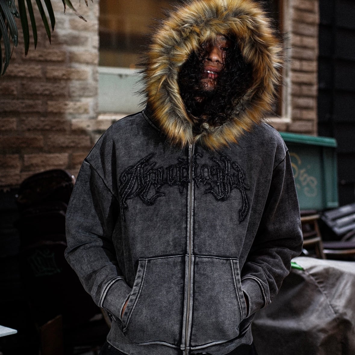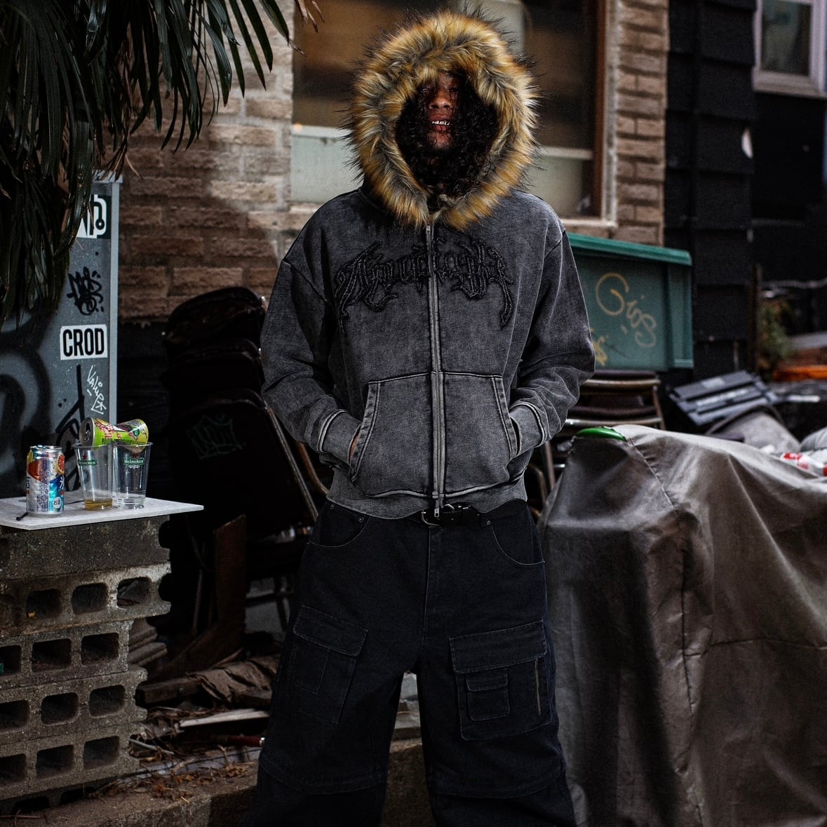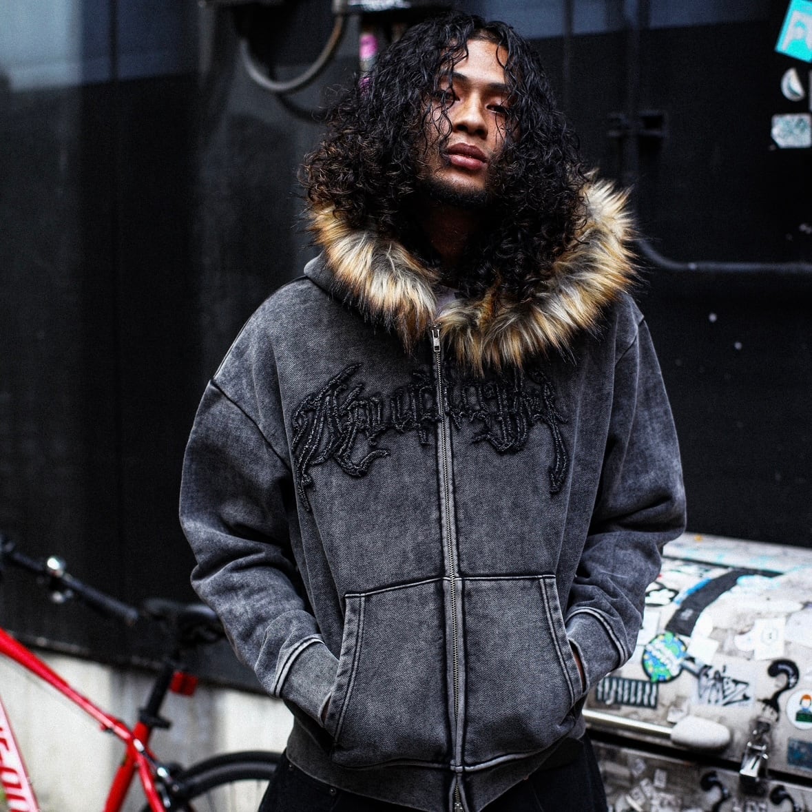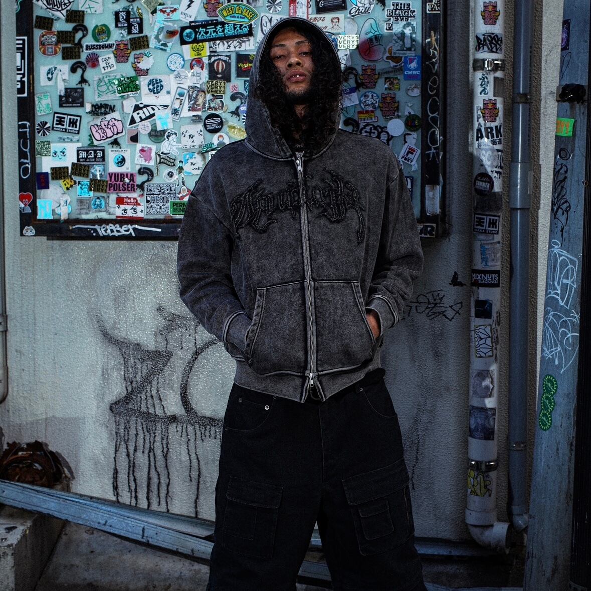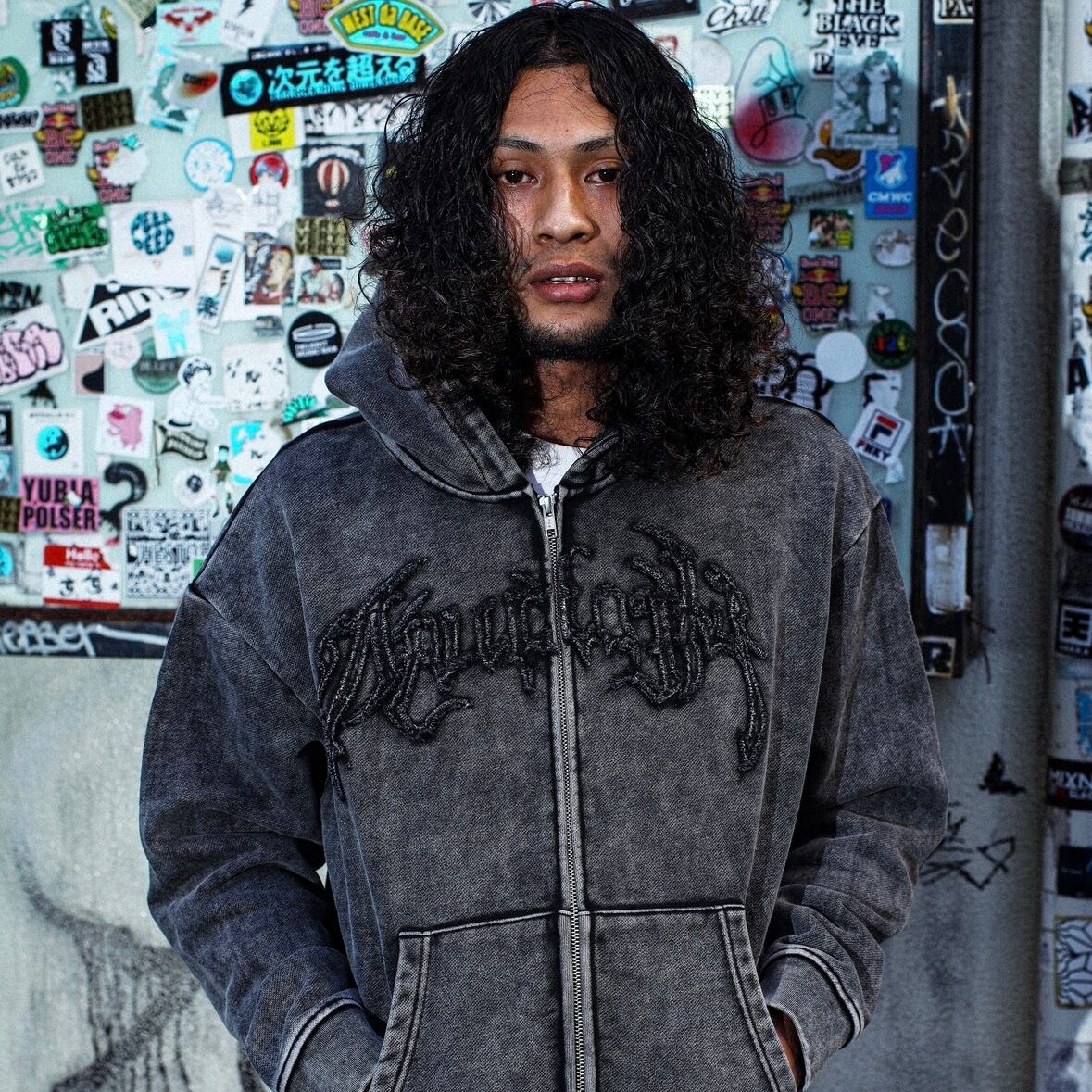 酸洗浄加工による奥行きのある表情と、可変性を備えたファージップフーディー。