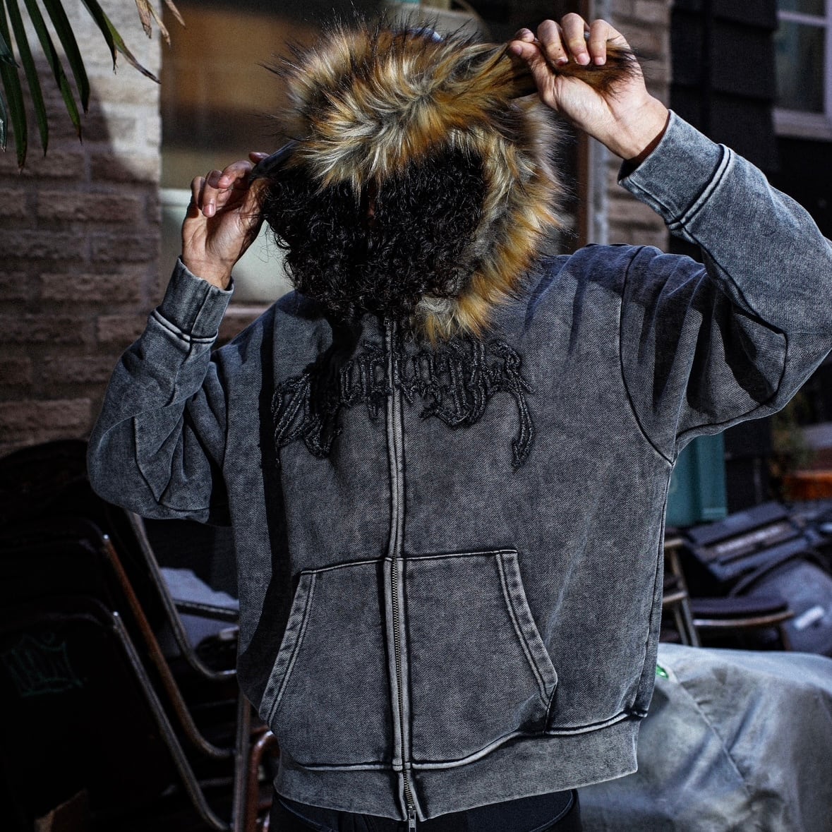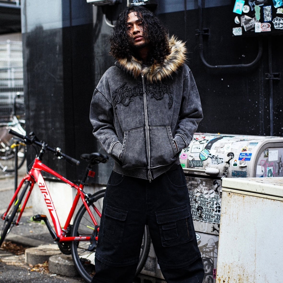 取り外し可能なファーで、ボリュームとミニマルを切り替え可能。ダブルジップ仕様により、開け方次第でシルエットと印象を変えられます。